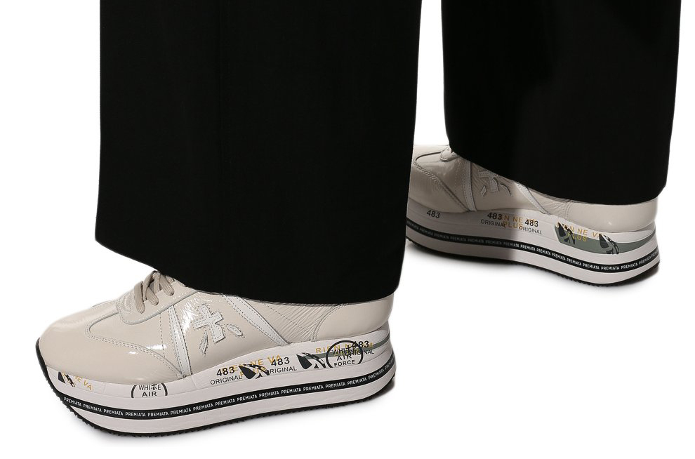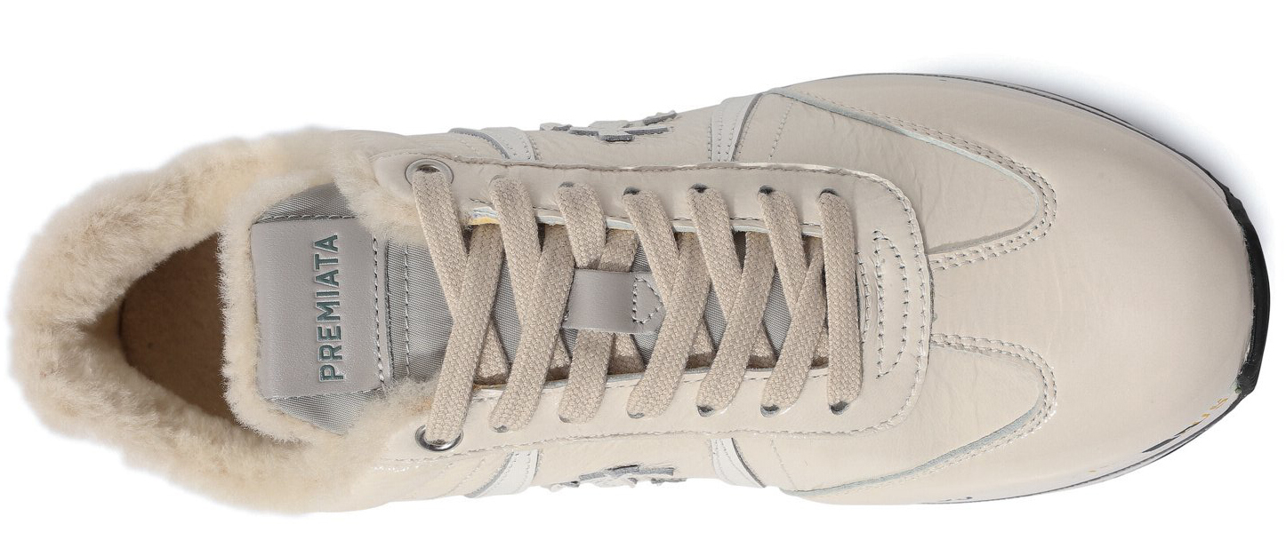 Закругленный мыс, функциональная шнуровка, облегченная подошва из ЭВА с добавлением резины с нанесенными по бокам брендовыми надписями и принтами, логотипы на боковинах, пятке и язычке, внутренняя отделка из текстиля и меха.