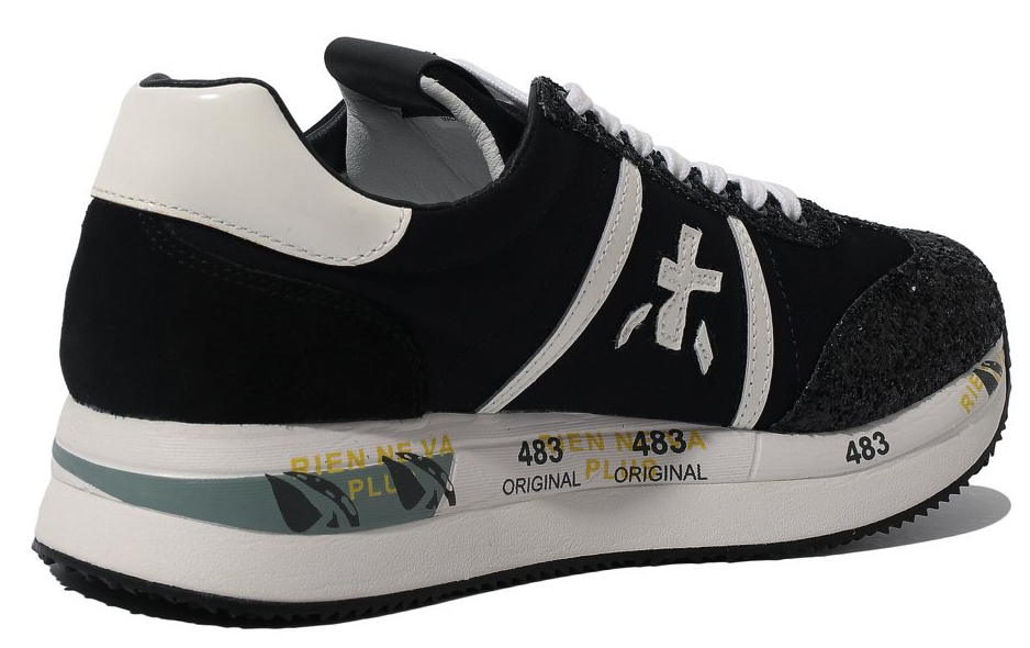 Идея дизайна верхней части модели Premiata Conny заключена в комбинации классической женской обуви, итальянской утонченности и стиля барокко. Высокая подошва из пеноматериала EVA украшена фирменным паттерном. Добавление пены Phylon, сжатой под давлением при воздействии высоких температур, обеспечивает дополнительную легкость и амортизацию. Сцепление с поверхностью гарантирует резиновая подметка.